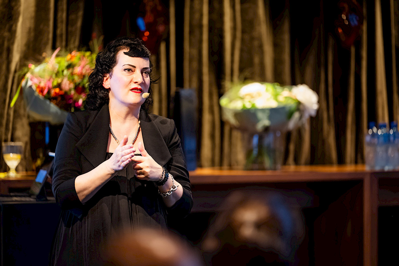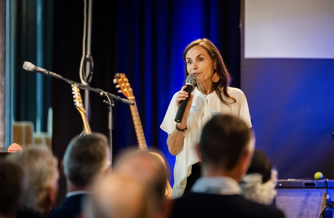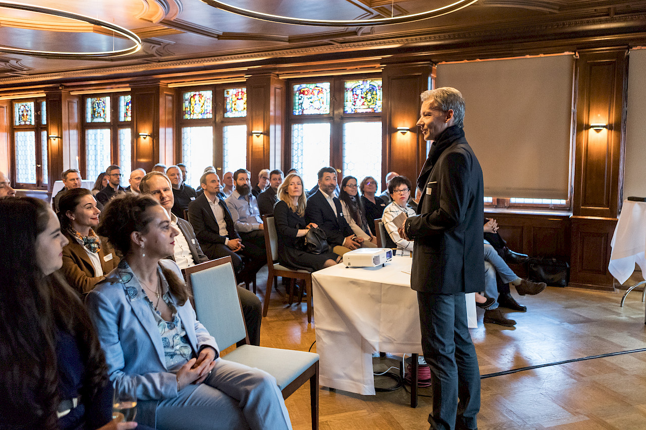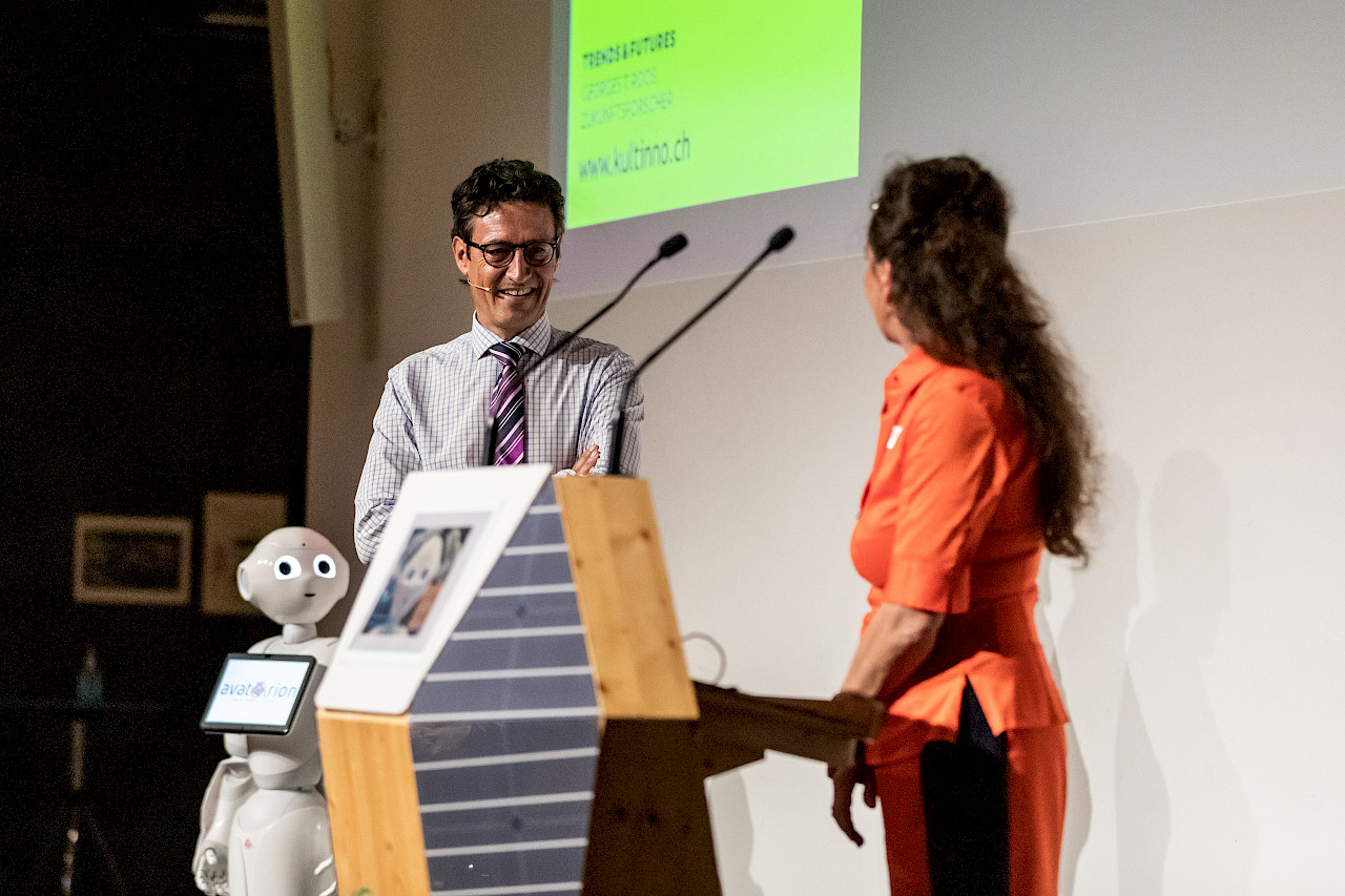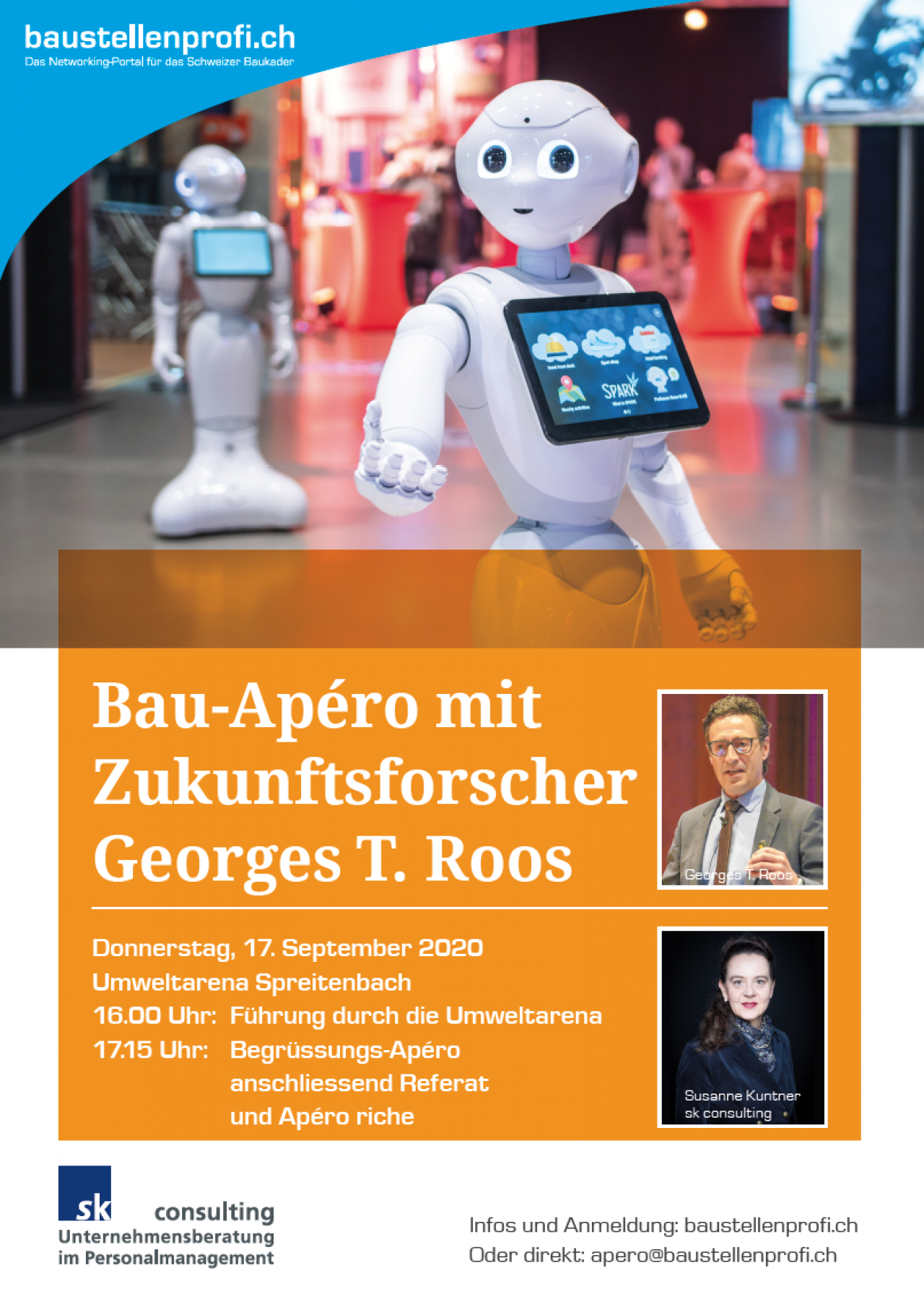 Keynote-Speaker Georges T. Roos nimmt Bauprofis mit in die ZukunftEin Hauch Magie wehte am frühen Abend des 17. Septembers 2020 durch die Umweltarena Spreitenbach, als die Künstliche Intelligenz Pepper mit freundlichen Worten und charmanter Geste Gastgeberin Susanne Kuntner auf die Bühne des gefüllten Saals bat.