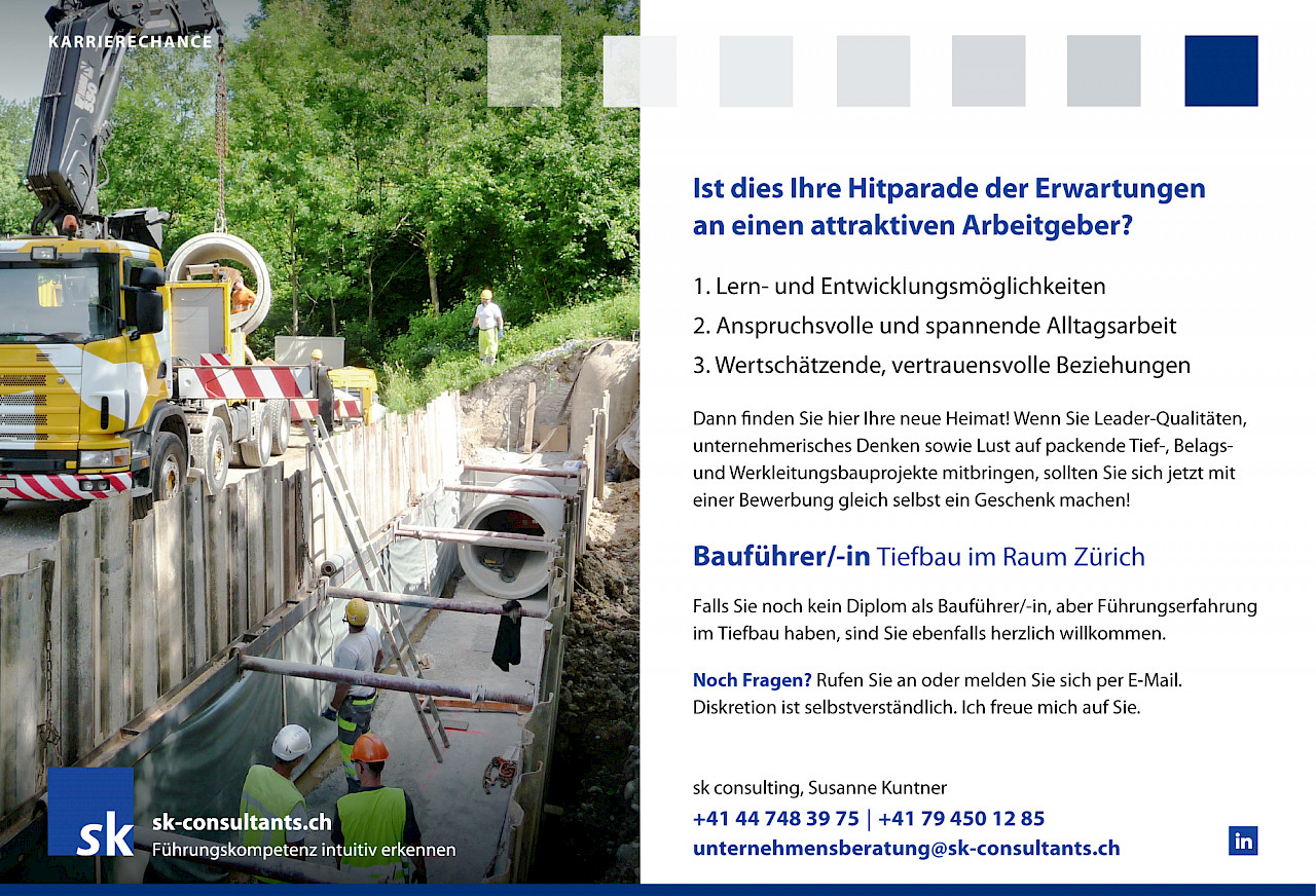 «Wir bieten das Umfeld für Erfolgsmomente, die alle Beteiligten vorwärtsbringen – und eine Menge Spass machen.»Im Gespräch mit Personal- und Unternehmensberaterin Susanne Kuntner spricht Eugenio Quadraccia von der Notter-Gruppe im aargauischen Wohlen über sein Führungsverständnis: «Ich setze nicht auf einen bestimmten Führungsstil. Denn ich habe in meinem Team ganz verschiedene Persönlichktein mit unterschiedlichen Stärken und Schwächen. Ihnen begegne ich individuell und immer mit dem Ziel, Erfolgserlebnisse zu kreieren». Lesen Sie das vollständige Interview jetzt in der März-Ausgabe der «baustellen» oder hier in der Kolumnen-Spalte.