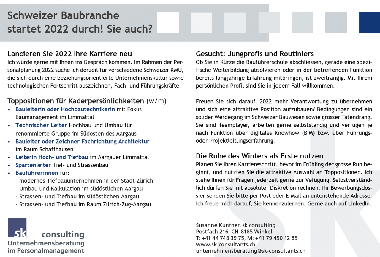 André Kesper hat sich mit Susanne Kuntner getroffen und sich mit ihr über das neue Jahr unterhalten. Die erfahrene Personal- und Unternehmensberaterin, gleichzeitig Vorstandsmitglied von Swissstaffing sowie Gastgeberin des Schweizer Bau-Apéros, erzählt von ihren spannenden Plänen und forumliert aus ihrer Sicht die Top-Skills, die 2021 zählen.
